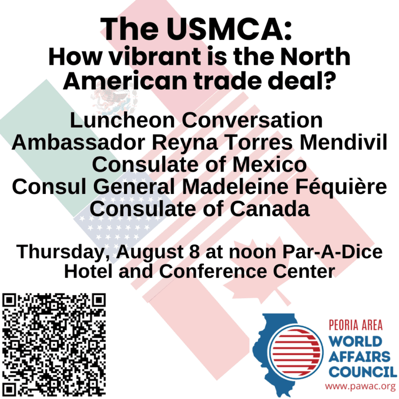 The trade agreement between these three neighbors is a vibrant part of the economy of Central Illinois. Join us for a discussion with some of the key policy influencers and our community members who are engaged in this trade from a wide variety of angles. From industry to agriculture, our neighbors are important trade partners. Tickets are $25.